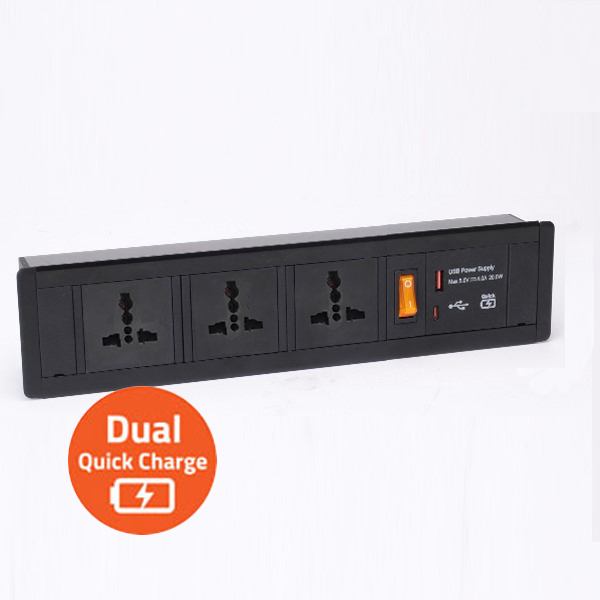 Recessed Mount Panel Power Station with UNI Socket and Dual USB Quick Charger / Black / Type- A C