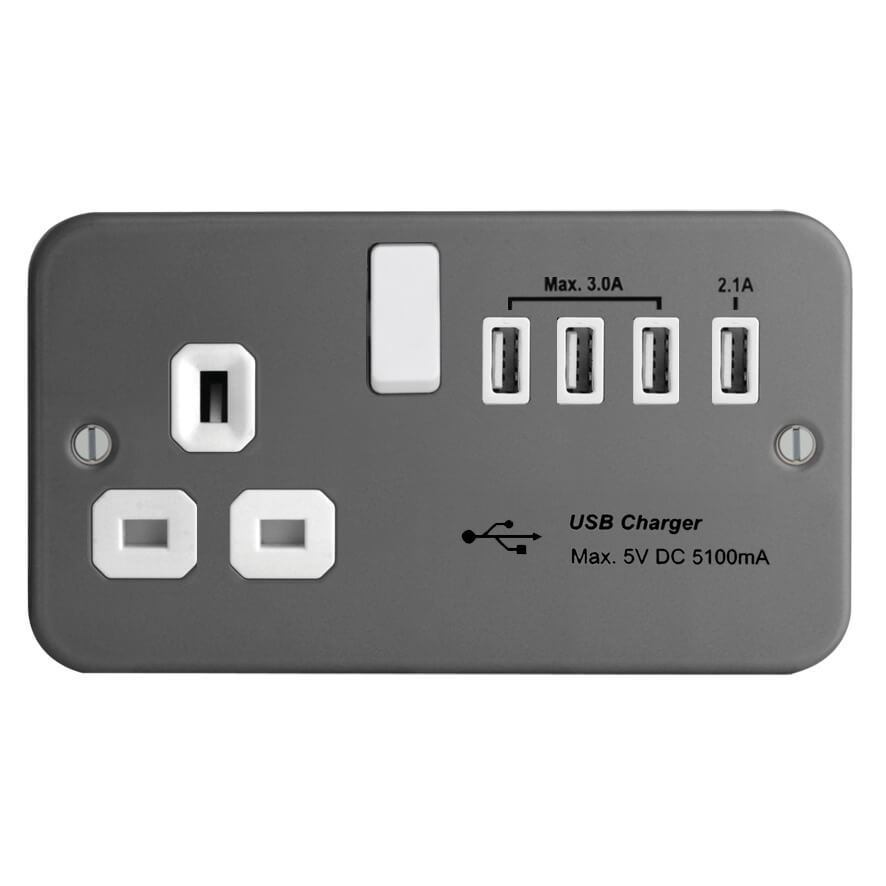 | FM288-4U | Metal Clad Range 1G 13A Switched Socket - SP with 5.1A Quad USB Charger | |
