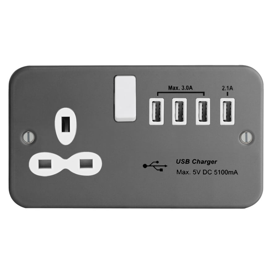 | FM388-4U | Metal Clad Range 1G 13A Switched Socket - SP with 5.1A Quad USB Charger | |