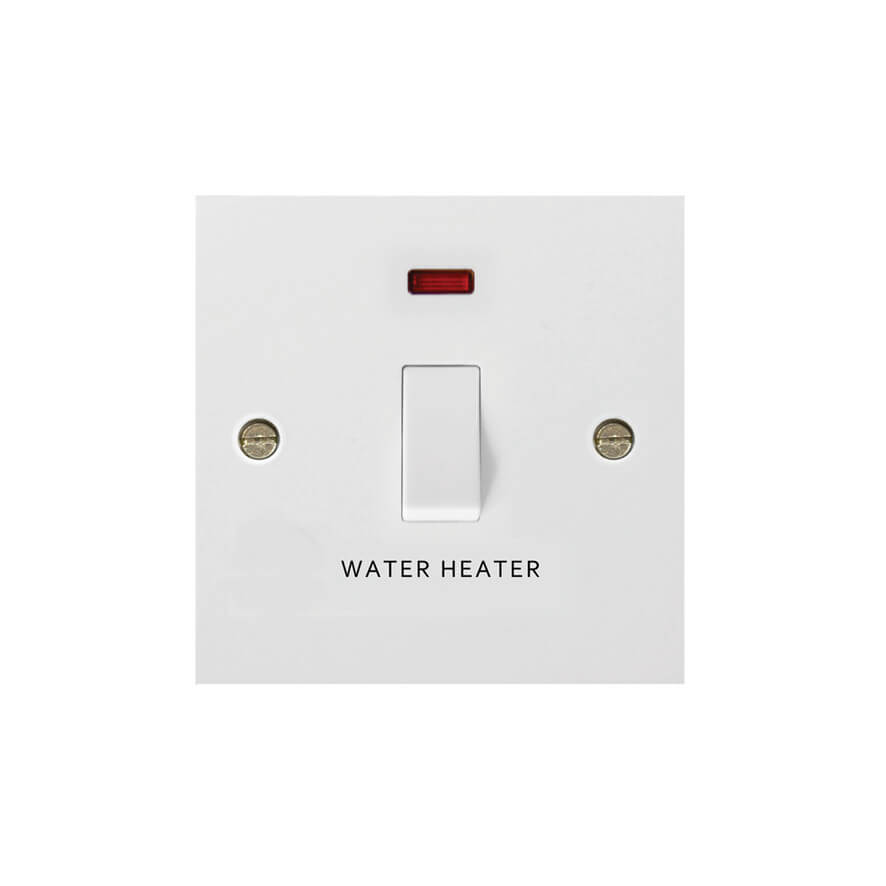 | 121NWH | Molded White Square Profile 1G 20A D.P. Switch with Neon - Printed Water Heater | |