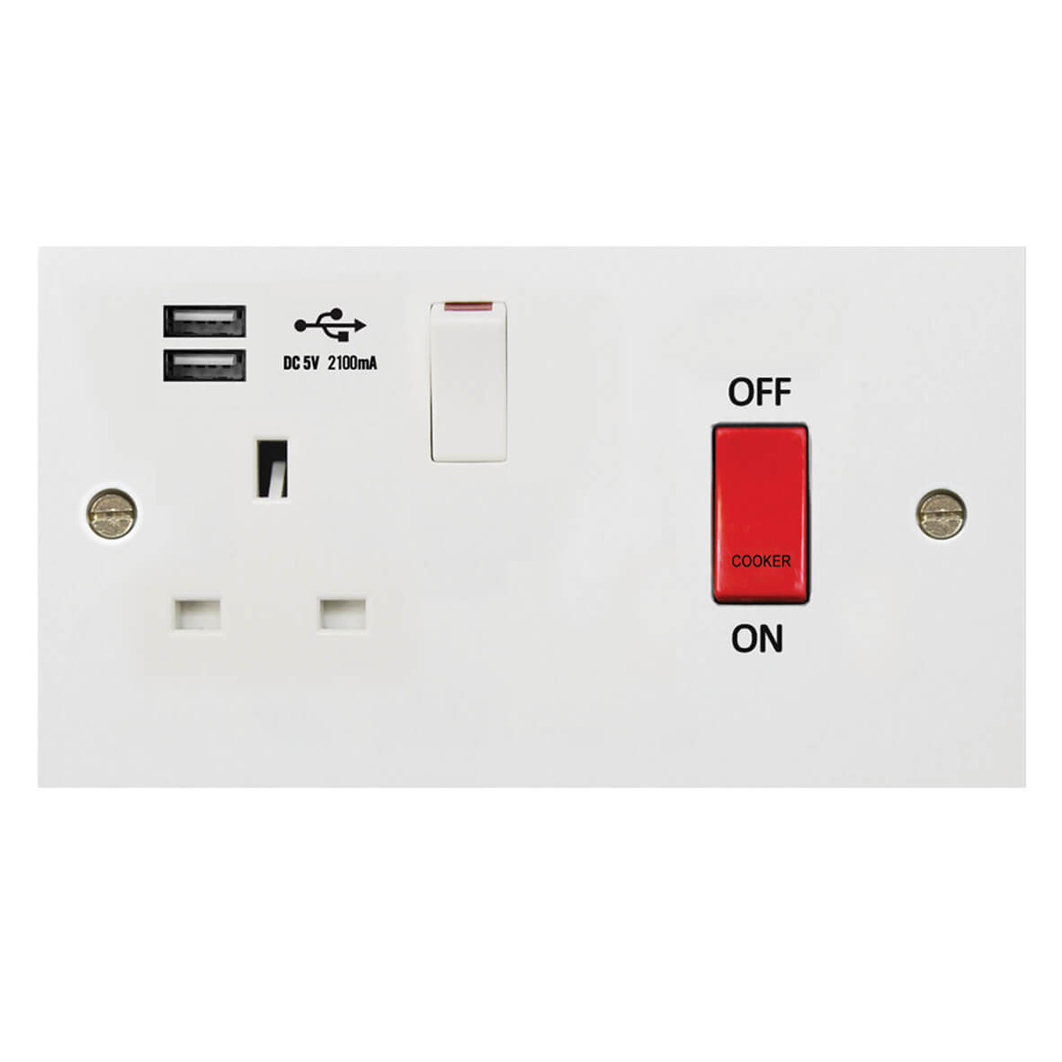 | 141-2U | Molded White Square Profile 45A D.P. Cooker Switch 13A Switched Socket USB (2.4A) | |