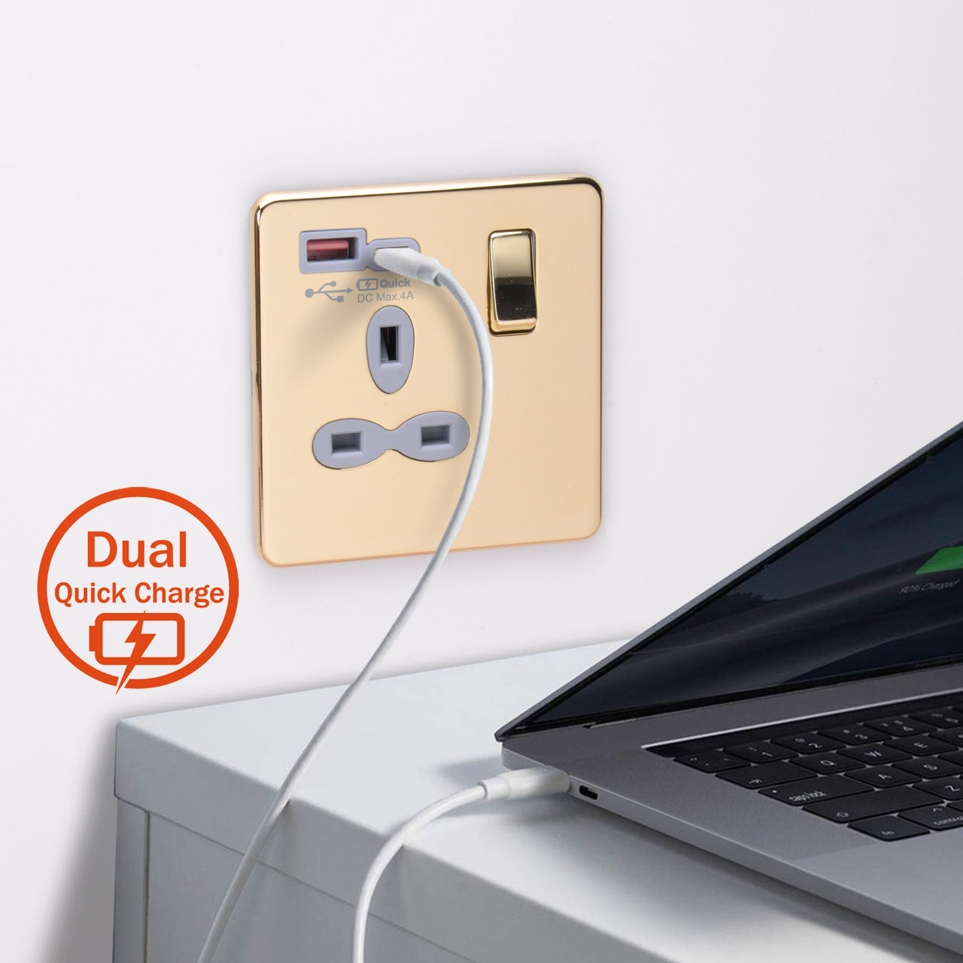 Screwless Flat Profile 1G 13A Switched Socket-SP with 4A Dual USB Quick Charger (USB-A/C)