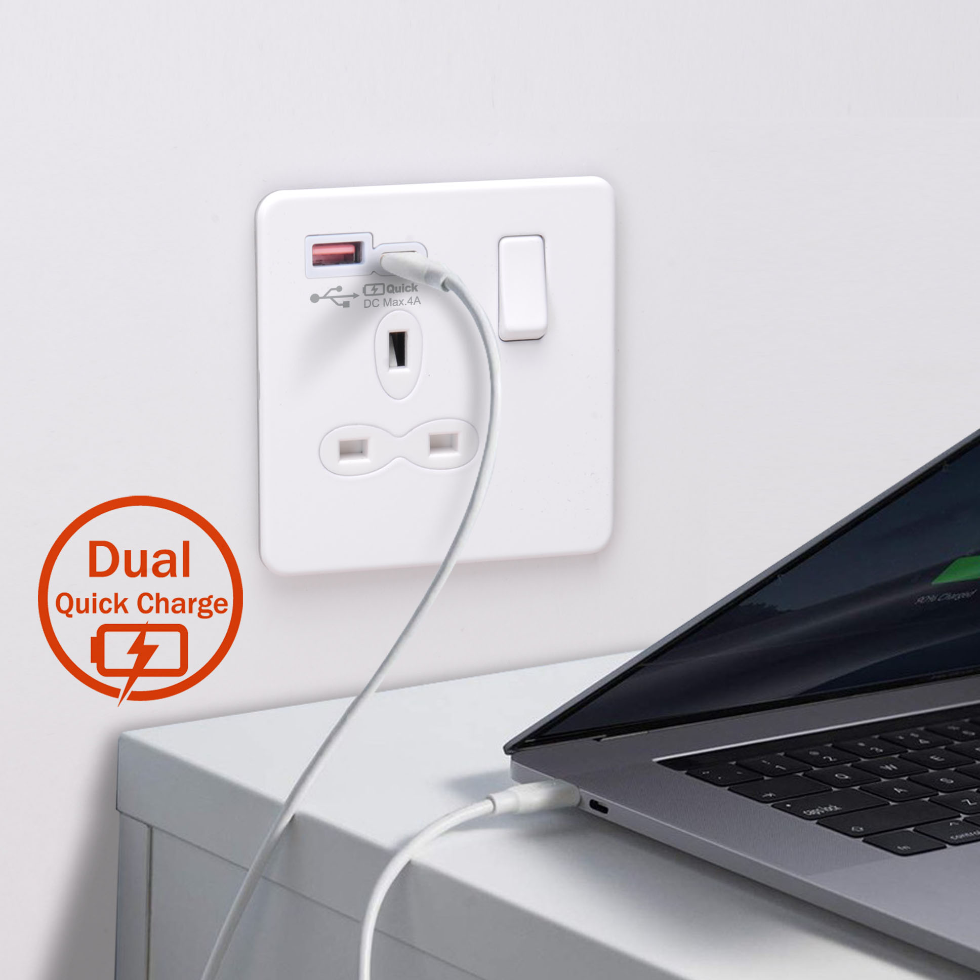 Screwless Flat Profile 1G 13A Switched Socket-SP with 4A Dual USB Quick Charger (USB-A/C)