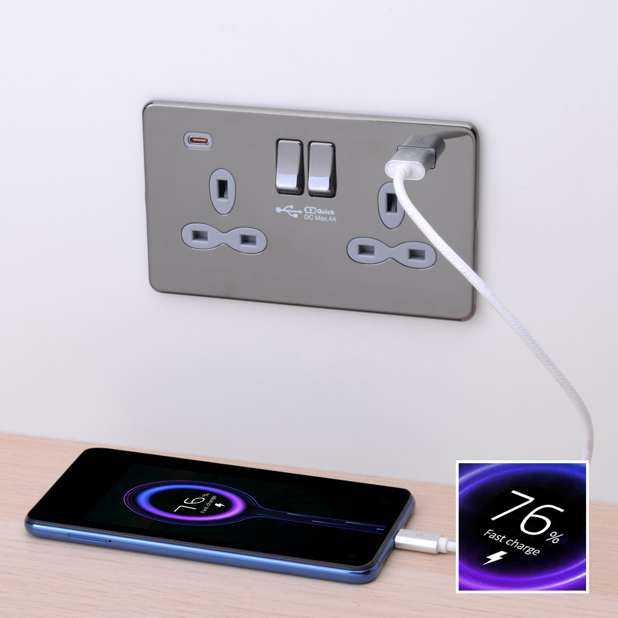 Screwless Flat Profile 2G 13A Switched Socket-DP with 4A Dual USB Charger ( Type A/A)