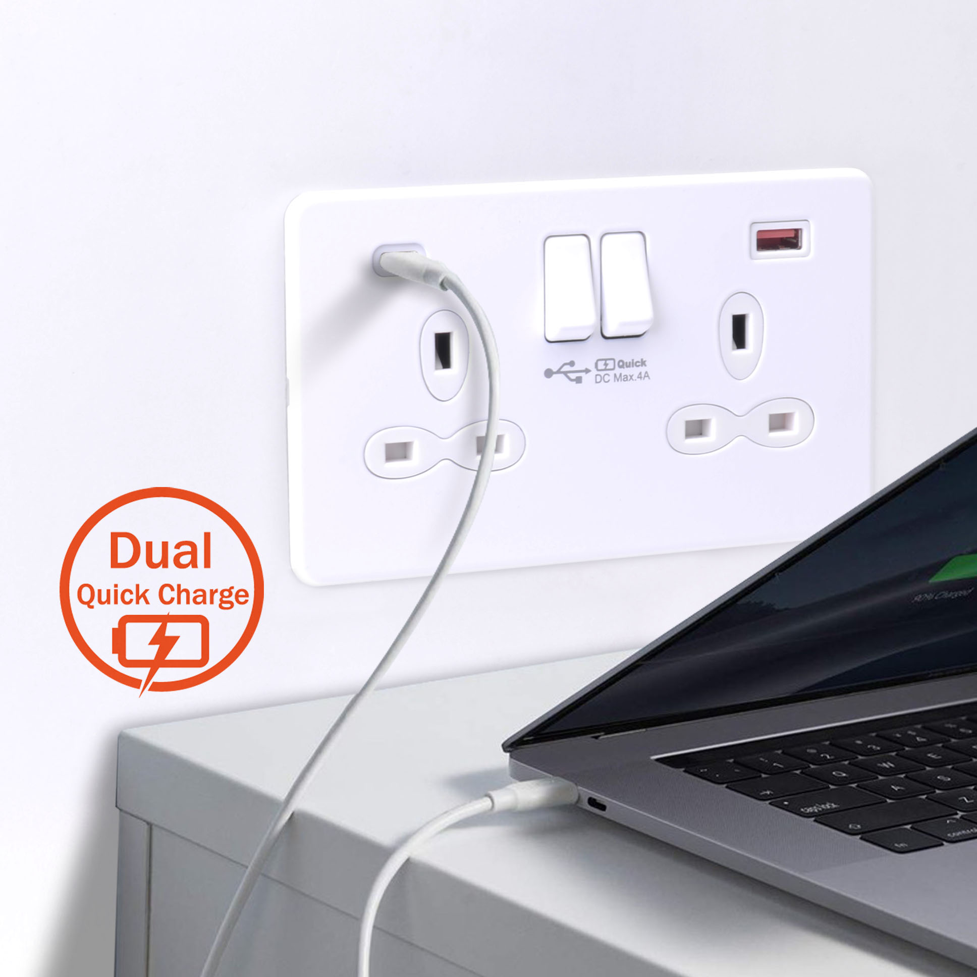 Screwless Flat Profile 2G 13A Switched Socket-DP with 4A Dual USB Charger ( Type A/C)