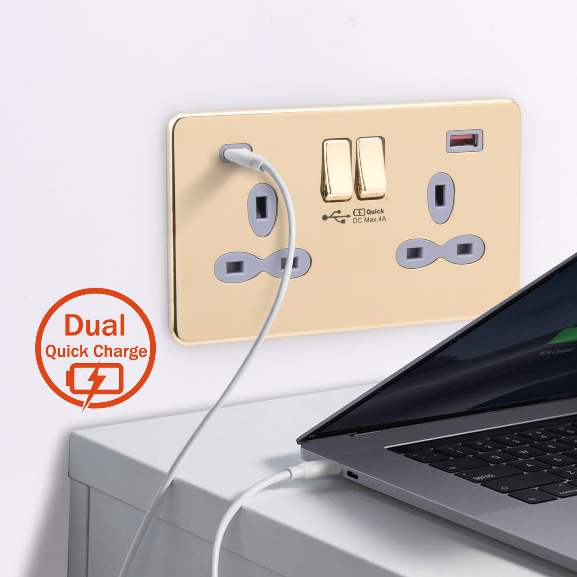 Screwless Flat Profile 2G 13A Switched Socket-SP with 4A Dual USB Charger ( Type A/C)