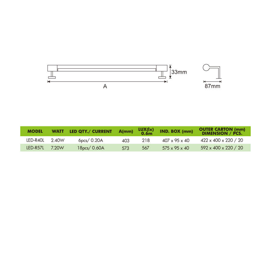 Dimension: 573mm (L) x 87mm (W) x 33mm (H)