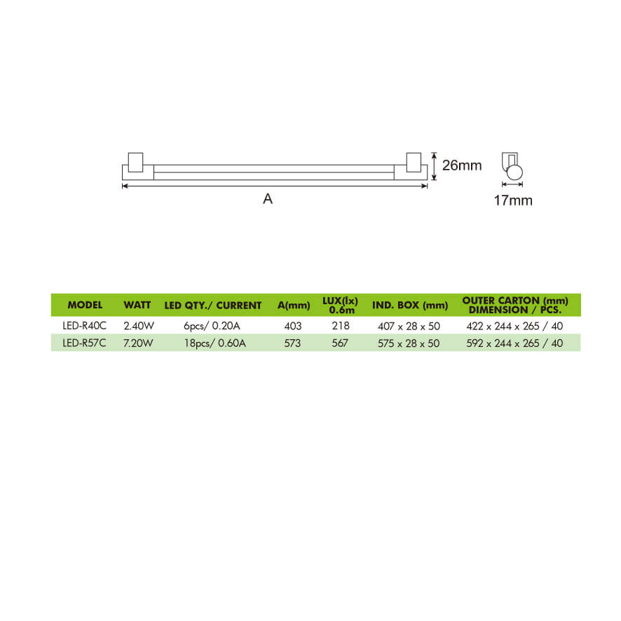 Dimension: 403mm (L) x 17mm (W) x 26mm (H)